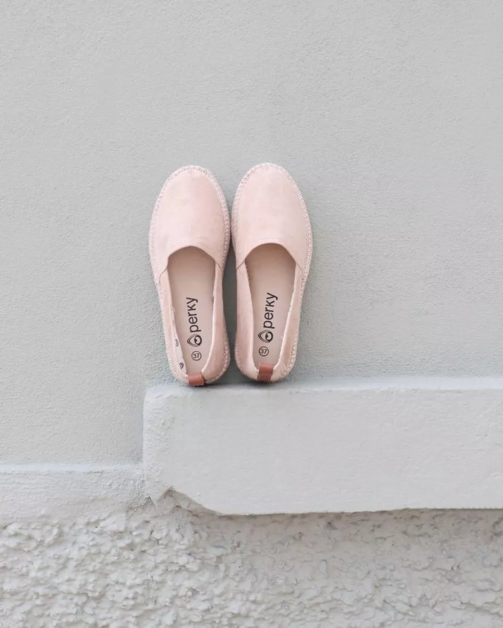 Różowe zamszowe espadryle z nowej kolekcji Perky. Materiał zewnętrzny to syntetyczny zamsz, wewnętrzna wyściółka to bawełna i syntetyczna wkładka wykonana z miękkiego lateksu. Lekka podeszwa wykonana jest z amortyzującej pianki EVA, obszyta na obwodzie naturalną plecionką z juty. Espadryle są wegańskie, wykonane bez użycia surowców pochodzenia zwierzęcego.