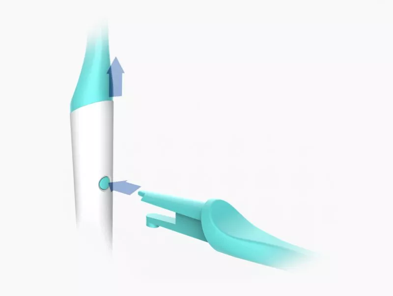 Wyjmij nową głowicę z opakowania i wciśnij jej końcówkę w oznaczone kółko na uchwycie, co pozwoli łatwo wyjąć starą głowicę i zamontować nową.